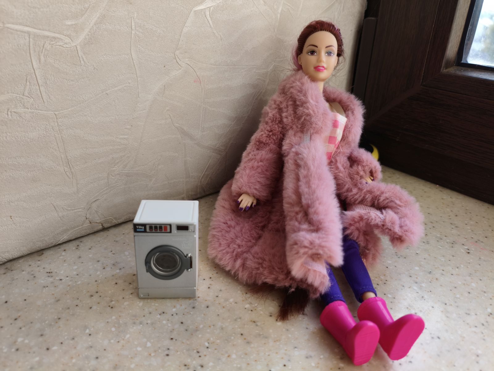 С точки зрения проработки, это, пожалуй, самая аккуратная игрушка из всех трёх. Нет облоя пластика, нет криво окрашенных деталей — всё на уровне. При ближайшем рассмотрении видно, что дизайн вдохновлён реальными моделями стиральных машин, с барабаном и имитацией панели управления. В сочетании с другими миниатюрами (пиццей, кухней, кастрюльками) создаётся полноценный мир, где куклы живут «по-взрослому».