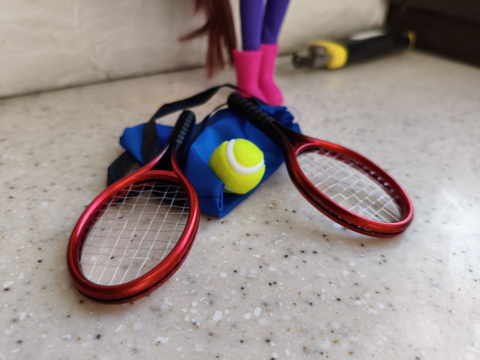 В набор входят две ракетки, мяч и миниатюрная сумка — всё выполнено в масштабе 1:12, но при этом с потрясающей проработкой. Сетка ракетки не просто нарисована, а действительно состоит из тончайших переплетённых нитей, ручка имеет рельеф, напоминающий обмотку, а мяч хоть и размером с горошину, но полностью повторяет форму теннисного. Цвета отправляются случайным образом — мне достались розовая и голубая ракетки, что, кстати, прекрасно подошло к кукольной паре дочки.