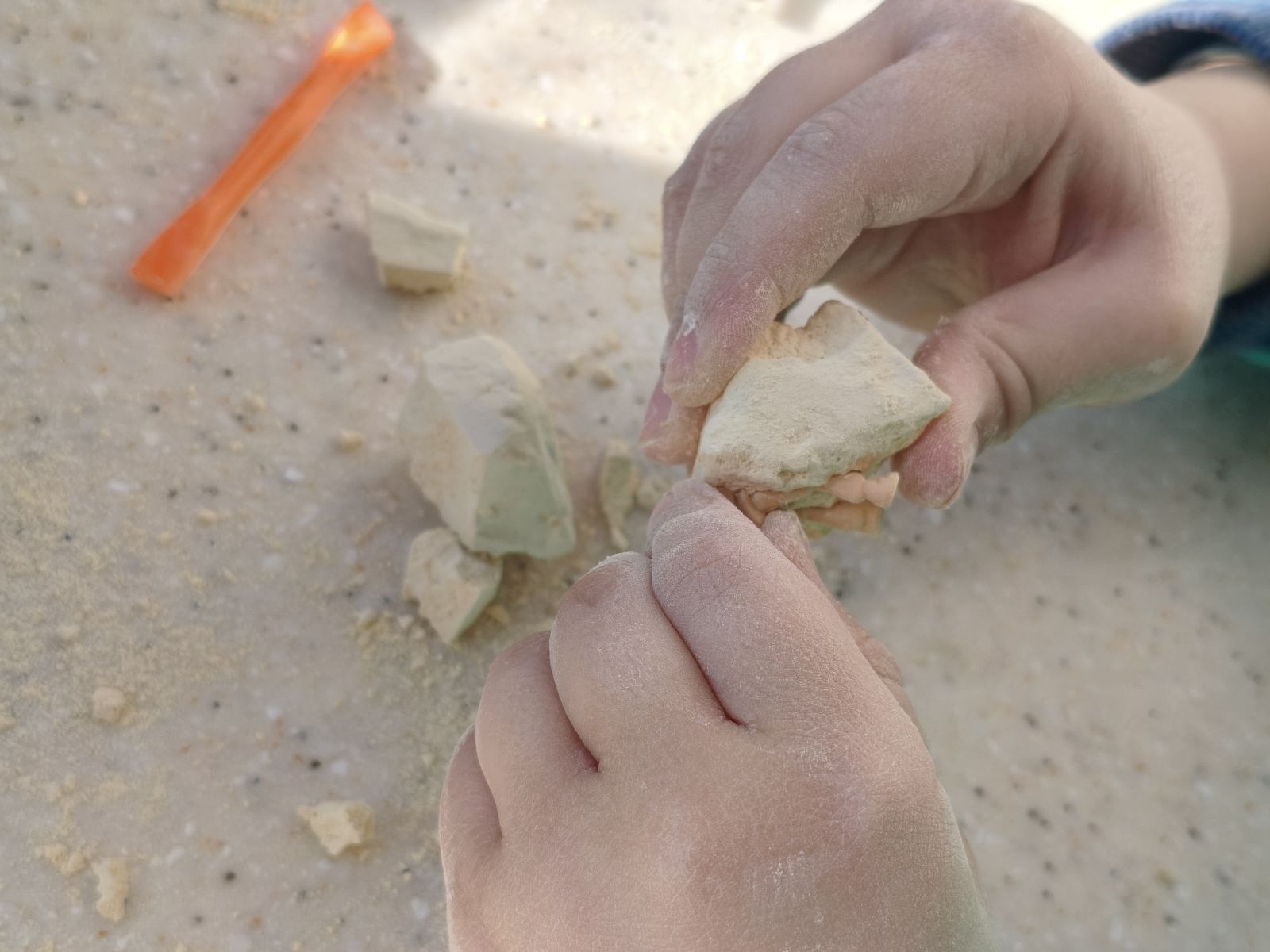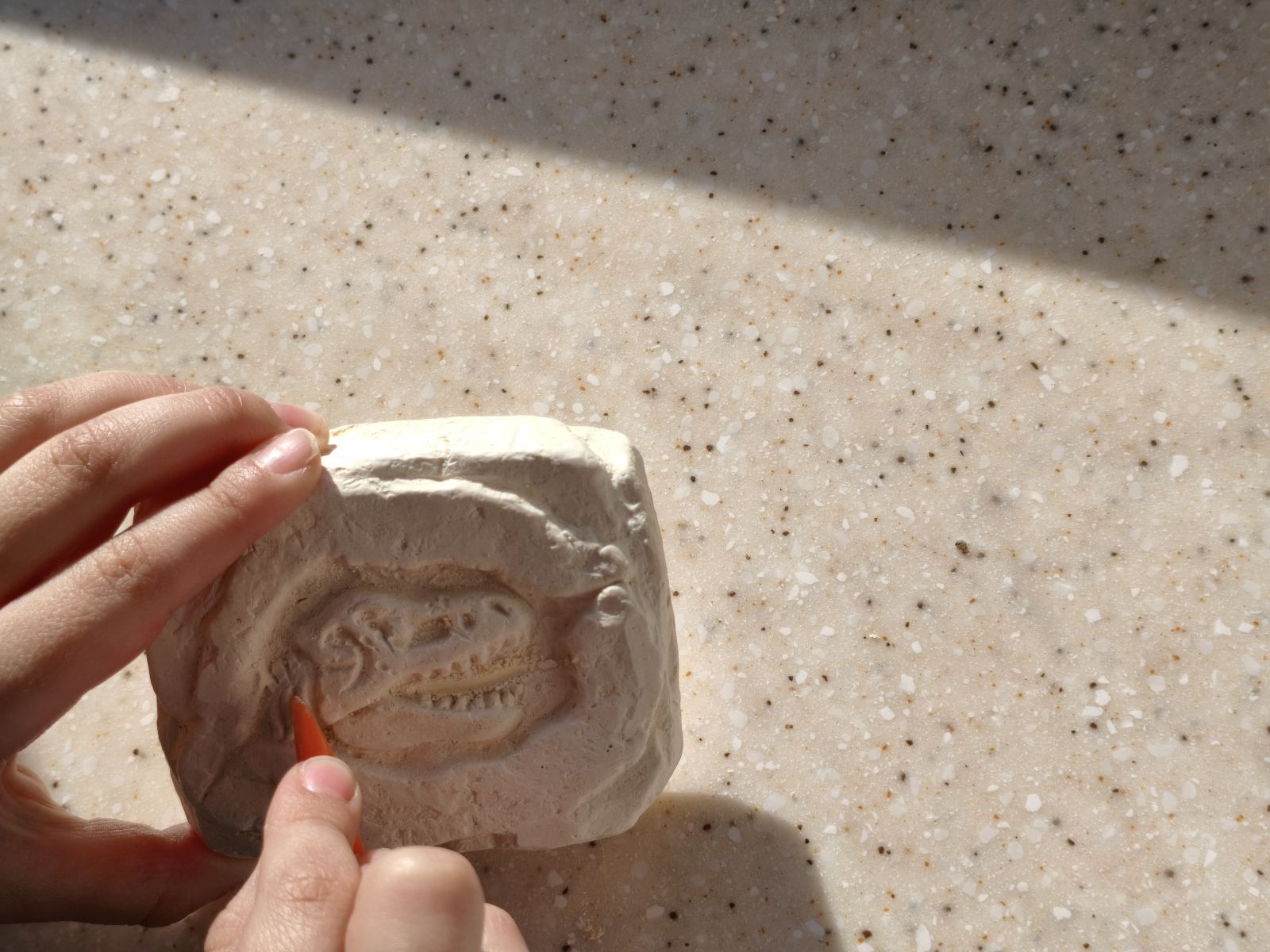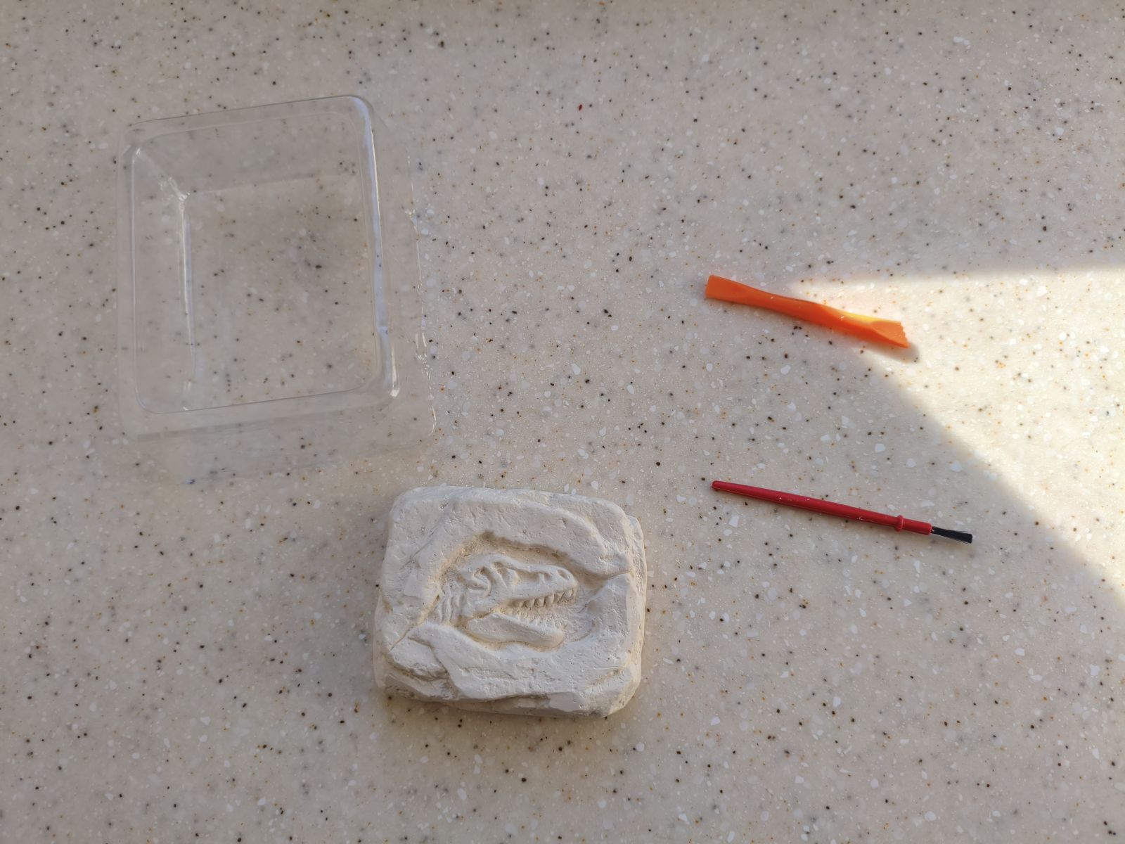 Второй момент — твердость гипса. Для некоторых детей блок оказался слишком крепким, и без помощи взрослого справиться было сложно. С другой стороны, именно это делает процесс более реалистичным. Здесь многое зависит от возраста и терпения ребенка.