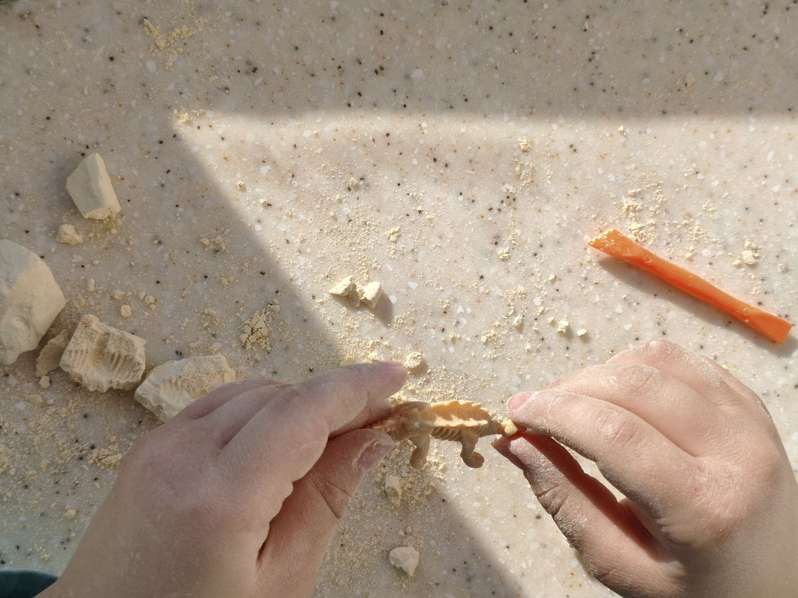 Кроме моторики развивается и усидчивость. В отличие от быстрых игрушек, где результат получается мгновенно, здесь требуется время. Нужно слой за слоем снимать гипс, искать спрятанные части скелета, аккуратно освобождать их. Это формирует терпение и умение доводить дело до конца.