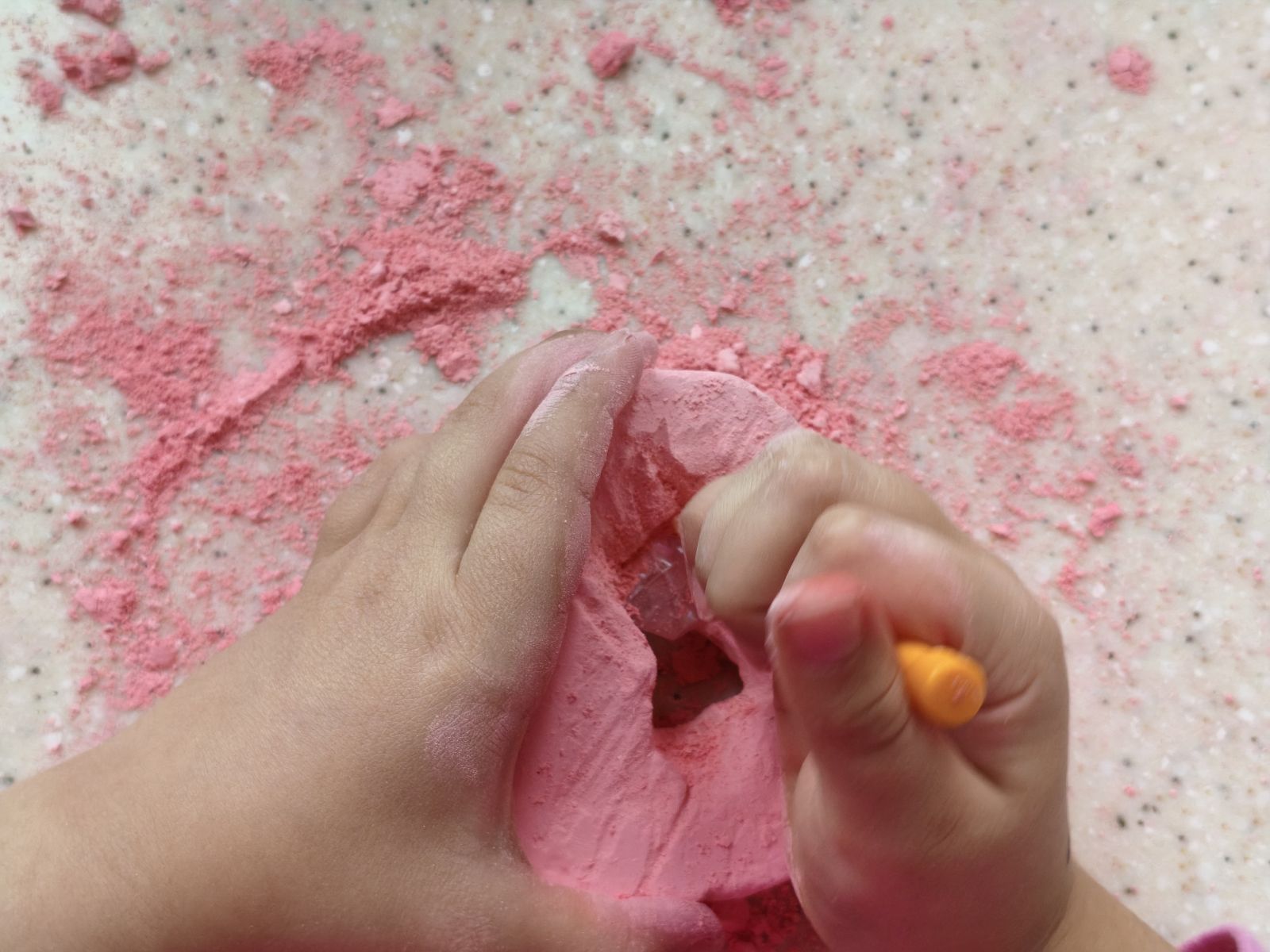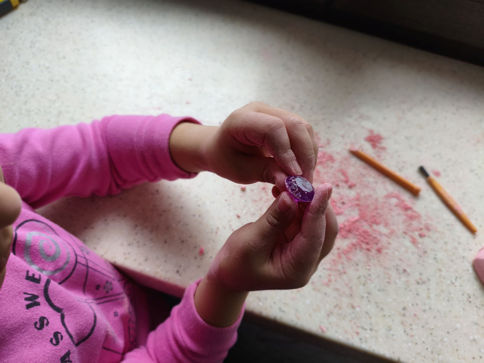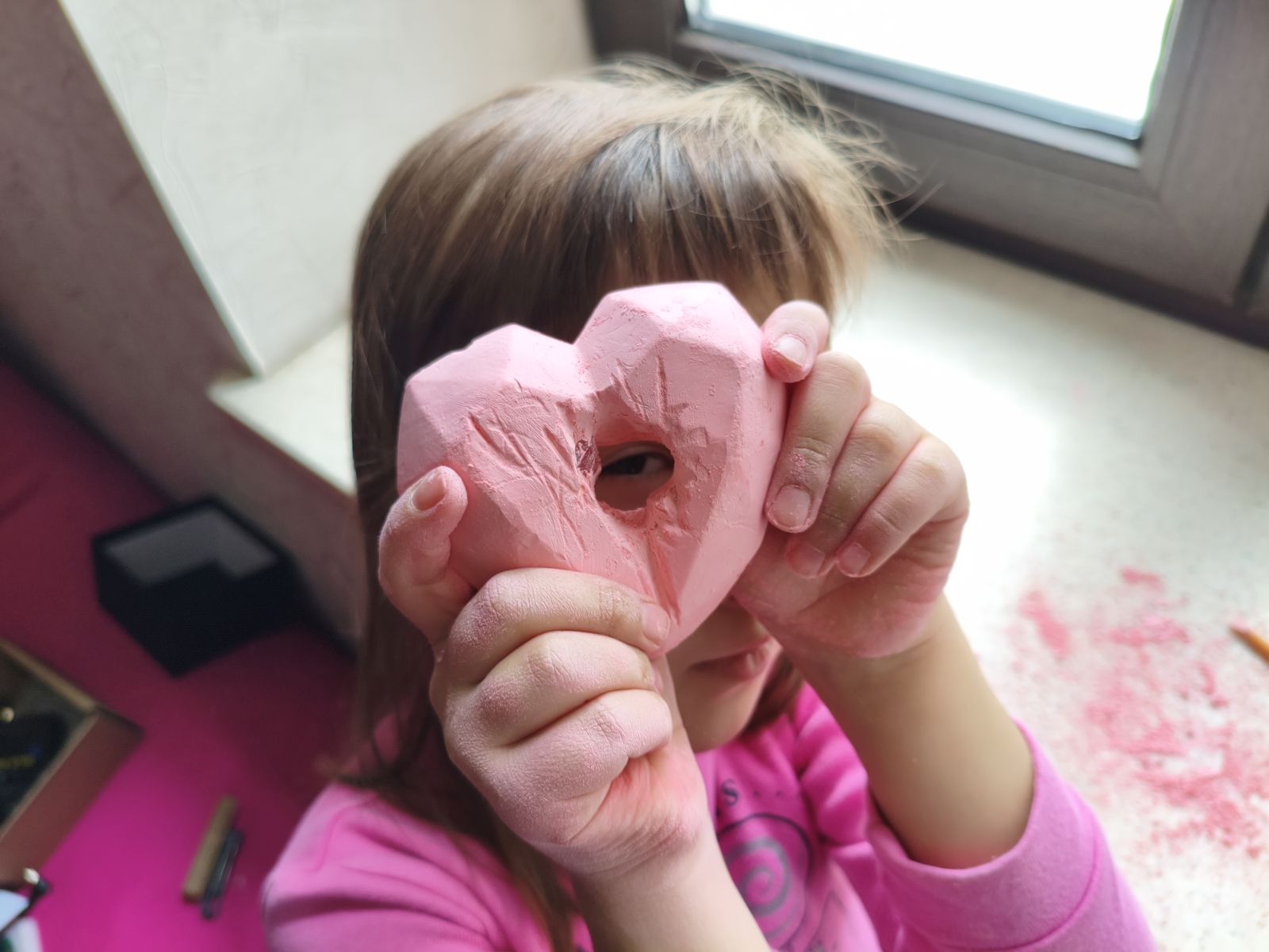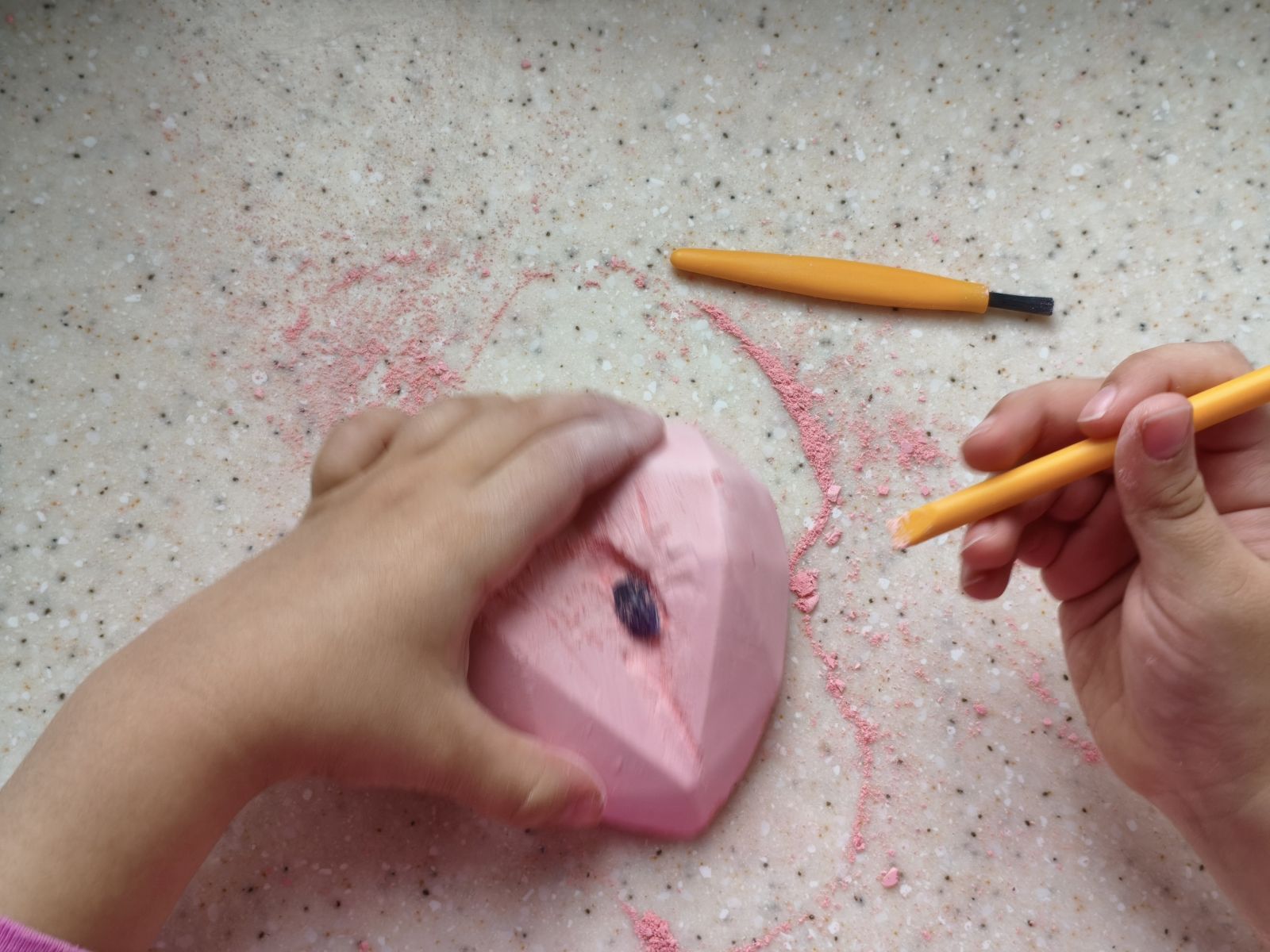 Она выбрала место на ковре, разложила всё сама — гипсовое сердечко, инструменты, миску с водой, салфетки. И началось. Сначала постукивание, потом легкое соскабливание, чуть-чуть пыли, и вдруг на поверхности появился первый кусочек камня. Всё — ребёнок уже полностью «в игре».