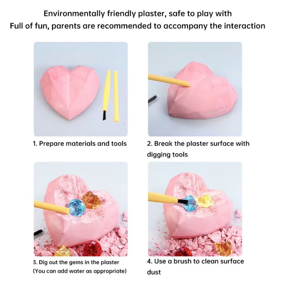 Всё это упаковано в прозрачную коробку с ярким оформлением. Дизайн понятный, не перегруженный — сердце с вкраплениями, внутри которого спрятаны камни. Для ребёнка это загадка, визуальный символ «сокровища». Для родителей — наглядное подтверждение, что ничего вредного внутри нет. В инструкции написано, что материал гипса — «eco-friendly plaster», и это действительно так: при замачивании водой блок размягчается без выделения пены, запаха или мутной жидкости. После раскопок его можно просто выбросить, не опасаясь пятен или химического следа.