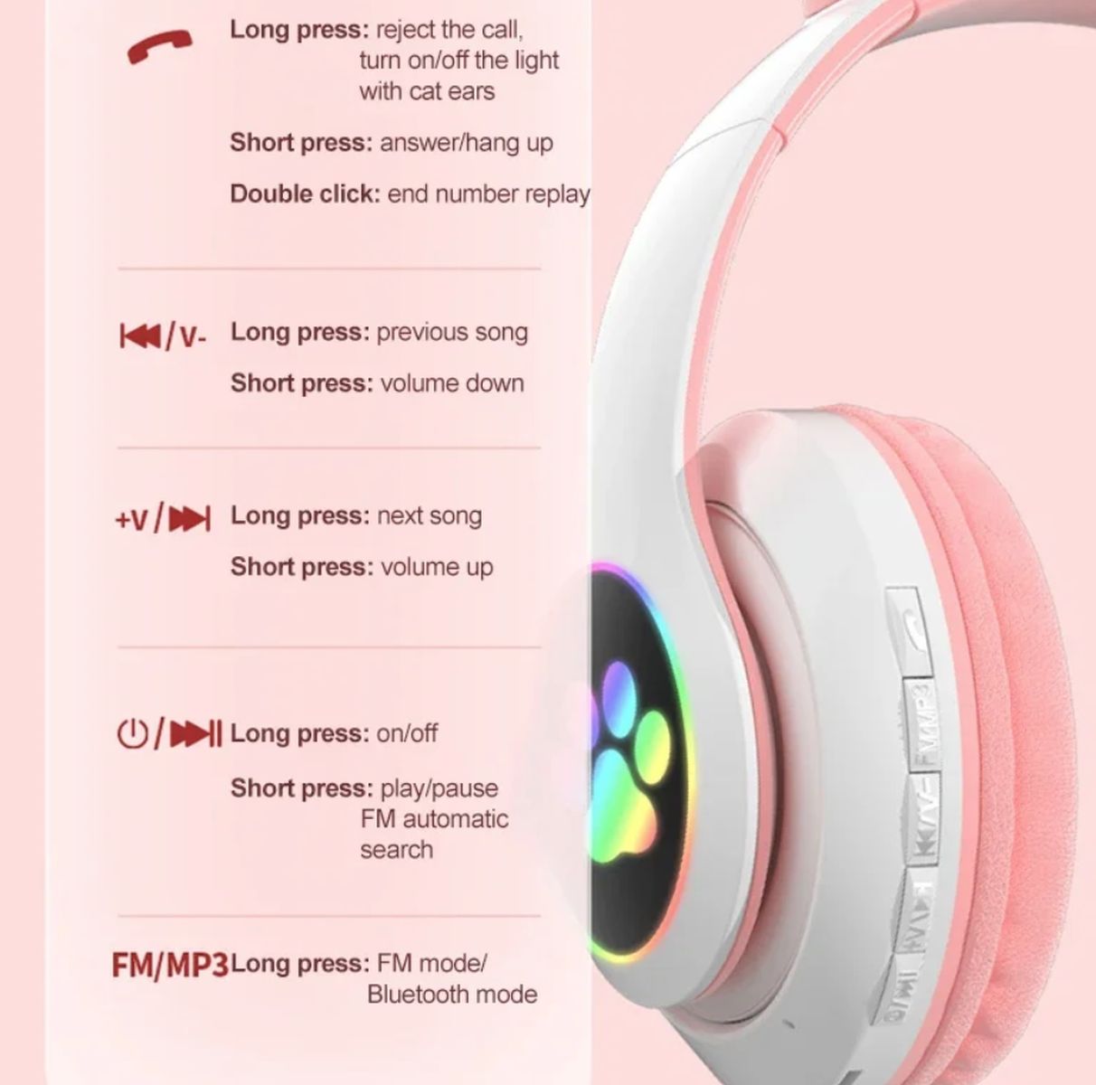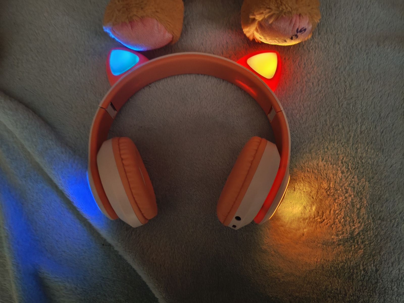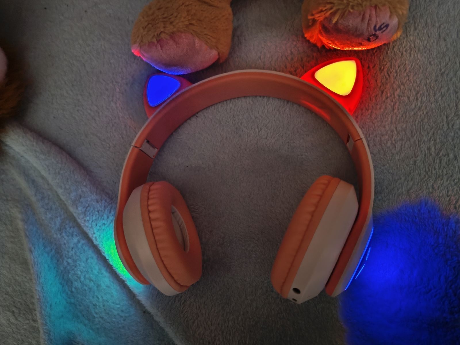 Одной из ключевых особенностей этих наушников с кошачьими ушками является встроенная подсветка. Именно она делает модель визуально привлекательной и сразу выделяет её среди обычных детских и подростковых наушников. Ушки подсвечиваются разноцветными LED-огнями в радужном режиме, и это не просто маркетинговый ход — для ребёнка или подростка такой элемент действительно превращает наушники в «вау-вещь», а не просто в устройство для звука.