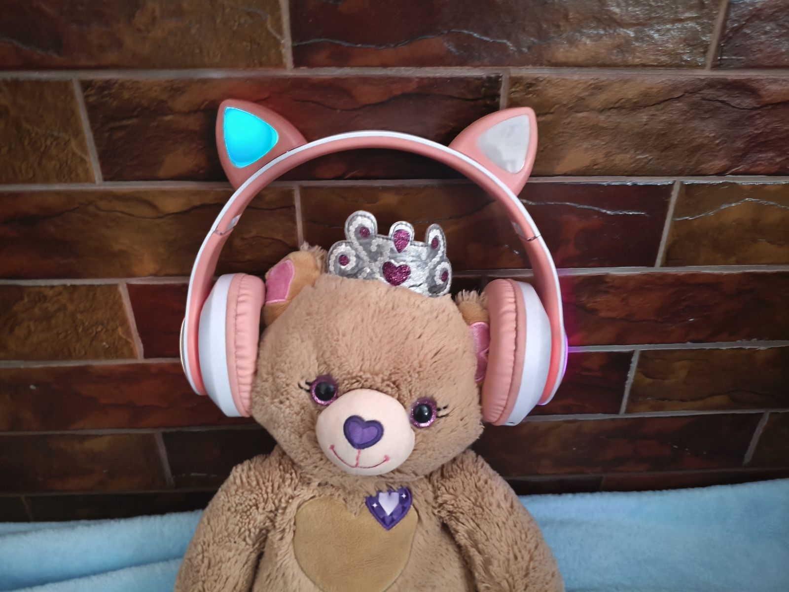 Начнём с общего впечатления. Наушники выглядят дороже, чем стоят. Яркий дизайн с кошачьими ушками и подсветкой сразу цепляет взгляд, особенно у детей и девочек-подростков. Это не просто аксессуар «для музыки», а вещь, которую хочется носить, показывать друзьям и использовать даже без включённого звука. Для многих детей внешний вид здесь важнее любых характеристик, и в этом плане производитель точно попал в цель.
