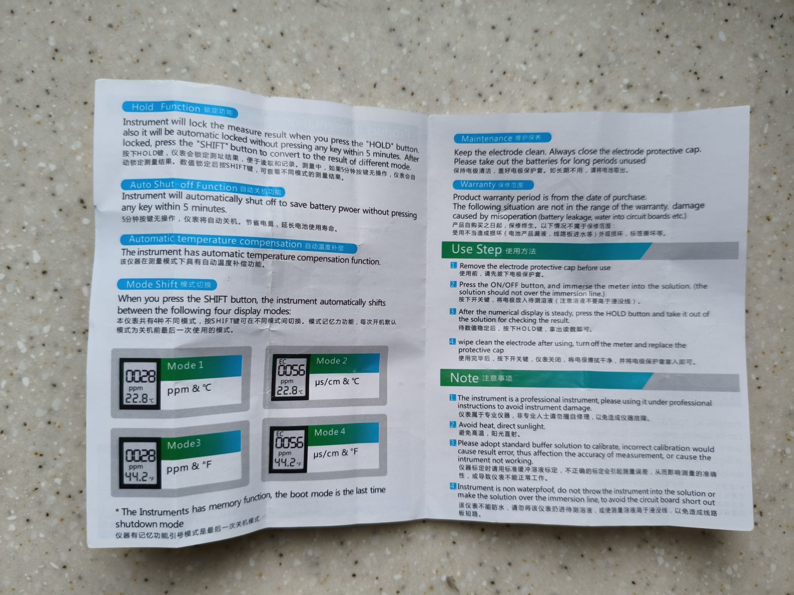 Да, тестер показывает температуру, но это скорее маркетинг: изменение °C никак не влияет на расчёт проводимости. И это видно по тестам — нагрев воды почти не менял значения TDS, хотя должен был. Также бросается в глаза разный результат при повторных измерениях одной и той же пробы — иногда разница доходила до 100–150 ppm.