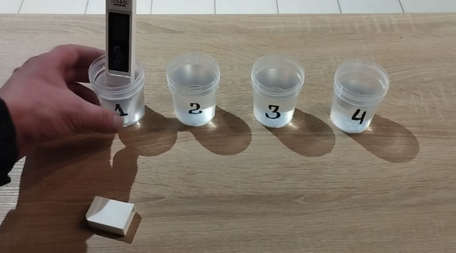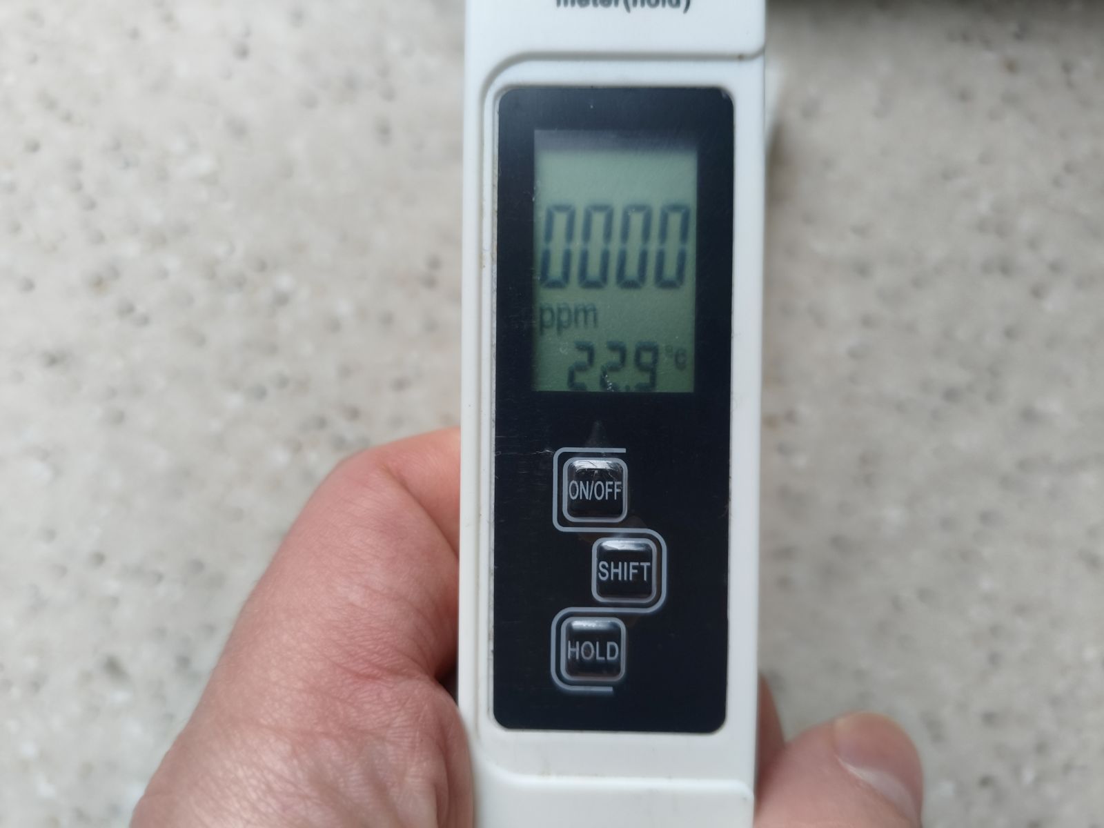 Я сравнил несколько образцов воды: из колодца, из-под крана, после фильтра обратного осмоса и минеральную из магазина. Казалось бы, логика должна быть очевидна: колодезная и водопроводная вода — с высоким TDS, осмос — с низким, а минеральная — где-то посередине. Но результаты были хаотичными. Устройство показывало случайные цифры — где-то 30 ppm, где-то 200, а иногда даже больше тысячи, без какой-либо корреляции с реальным качеством воды.