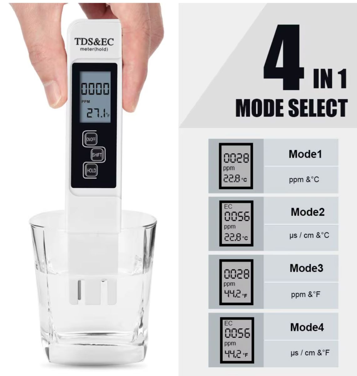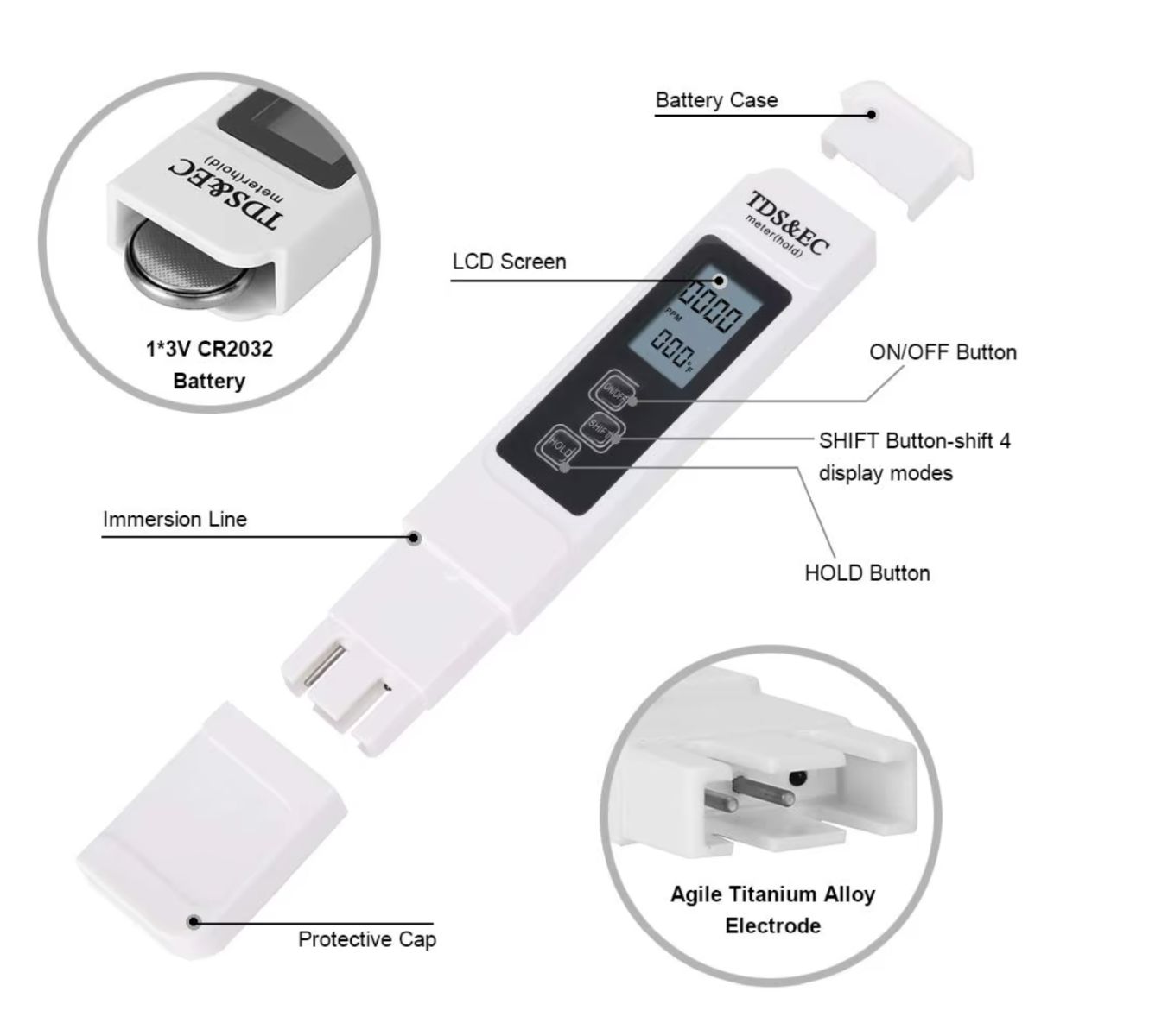Когда я заказал этот белый портативный цифровой тестер TDS, ожидания были вполне обычными: проверить, насколько чистая у меня вода — из колодца, после фильтра обратного осмоса, из-под крана и даже минеральная из бутылки. На фото устройство выглядело аккуратно, с большим дисплеем, обещающим точные измерения. Продавец уверял, что тестер «высокоточный», измеряет TDS, электропроводность и температуру воды, а диапазон — до 9999 ppm. Казалось, за пару долларов можно получить инструмент, с которым легко проверить качество воды дома или на даче.