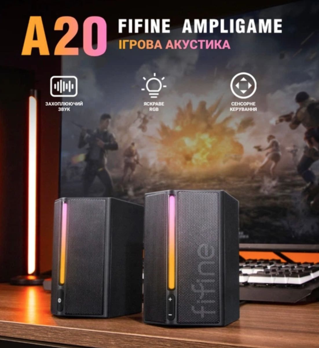 Когда долго играешь или работаешь за компьютером, даже самые лёгкие наушники начинают утомлять. Давление на голову, усталость слуха, ощущение «закрытого» звука — всё это знакомо многим. Именно в такие моменты начинаешь смотреть в сторону компактной настольной акустики. Fifine A20 — как раз из этой категории: небольшая 2.0-система, ориентированная на геймеров и тех, кто проводит много времени за ПК.