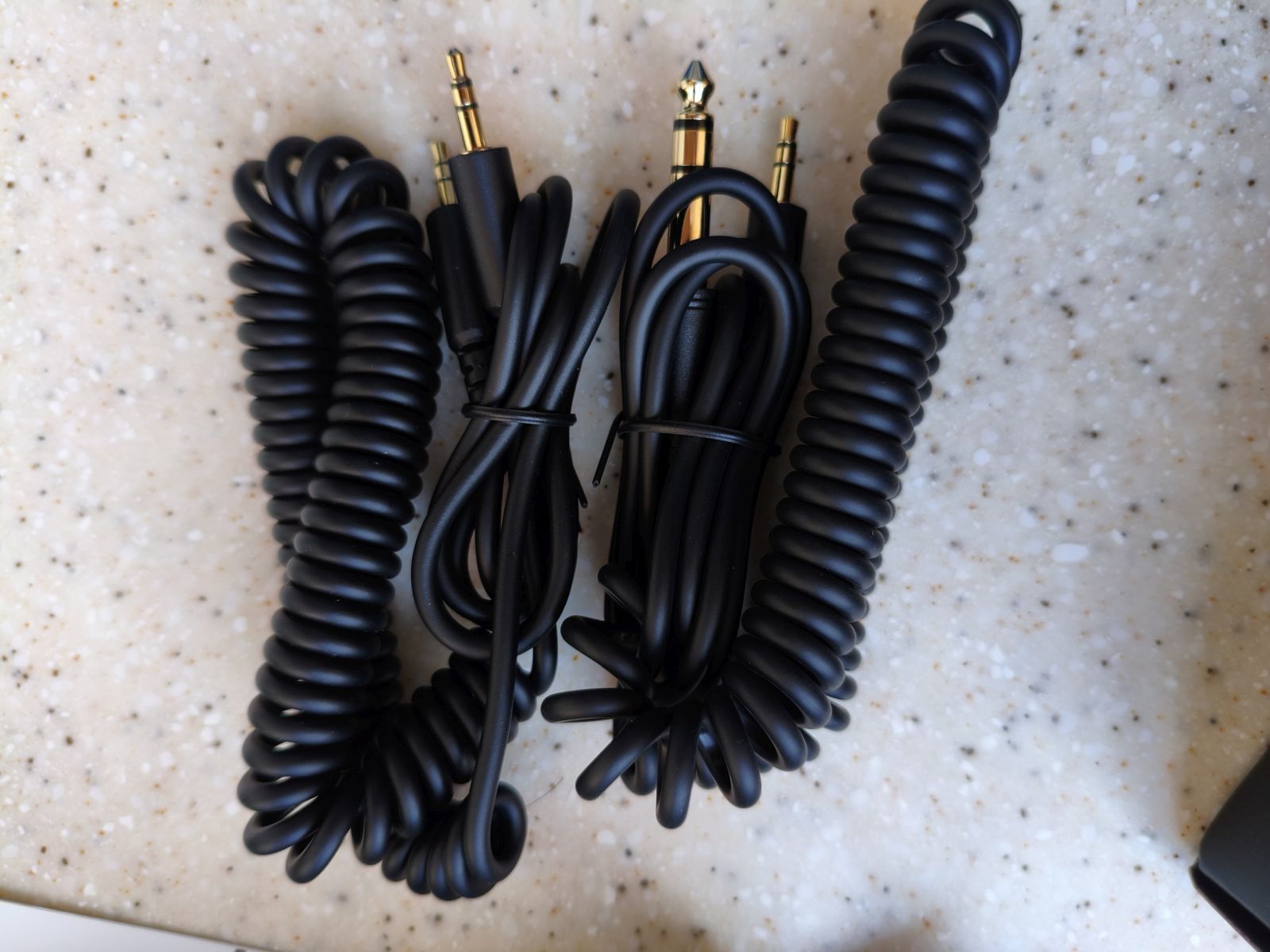 Кабель спиральный, что действительно удобно: в обычном состоянии он короткий и не мешает, а при необходимости растягивается, давая запас длины. Это удобно, если вы подключаетесь к разным устройствам или сидите на удалении от источника звука. Также плюс — сменные кабели: можно заменить провод, если потребуется, без замены самих наушников.