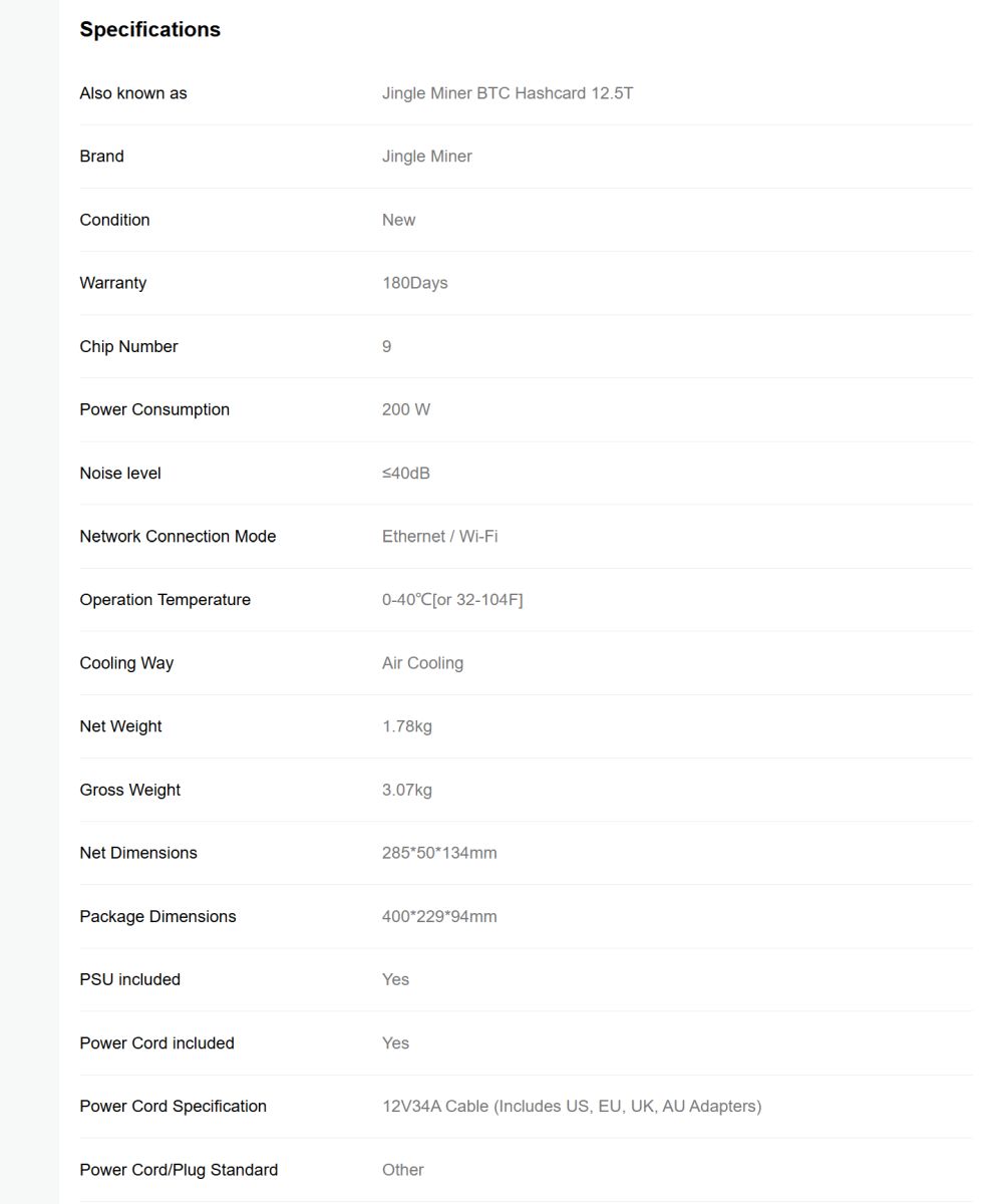 В целом Jingle Miner BTC Hashcard 12.5T выглядит как нишевое, но логично продуманное решение. Он делает акцент не на максимальной мощности, а на балансе между производительностью, энергопотреблением и уровнем шума. В условиях, когда многие майнеры становятся всё более требовательными к ресурсам, такой подход может быть привлекательным для определённой аудитории.