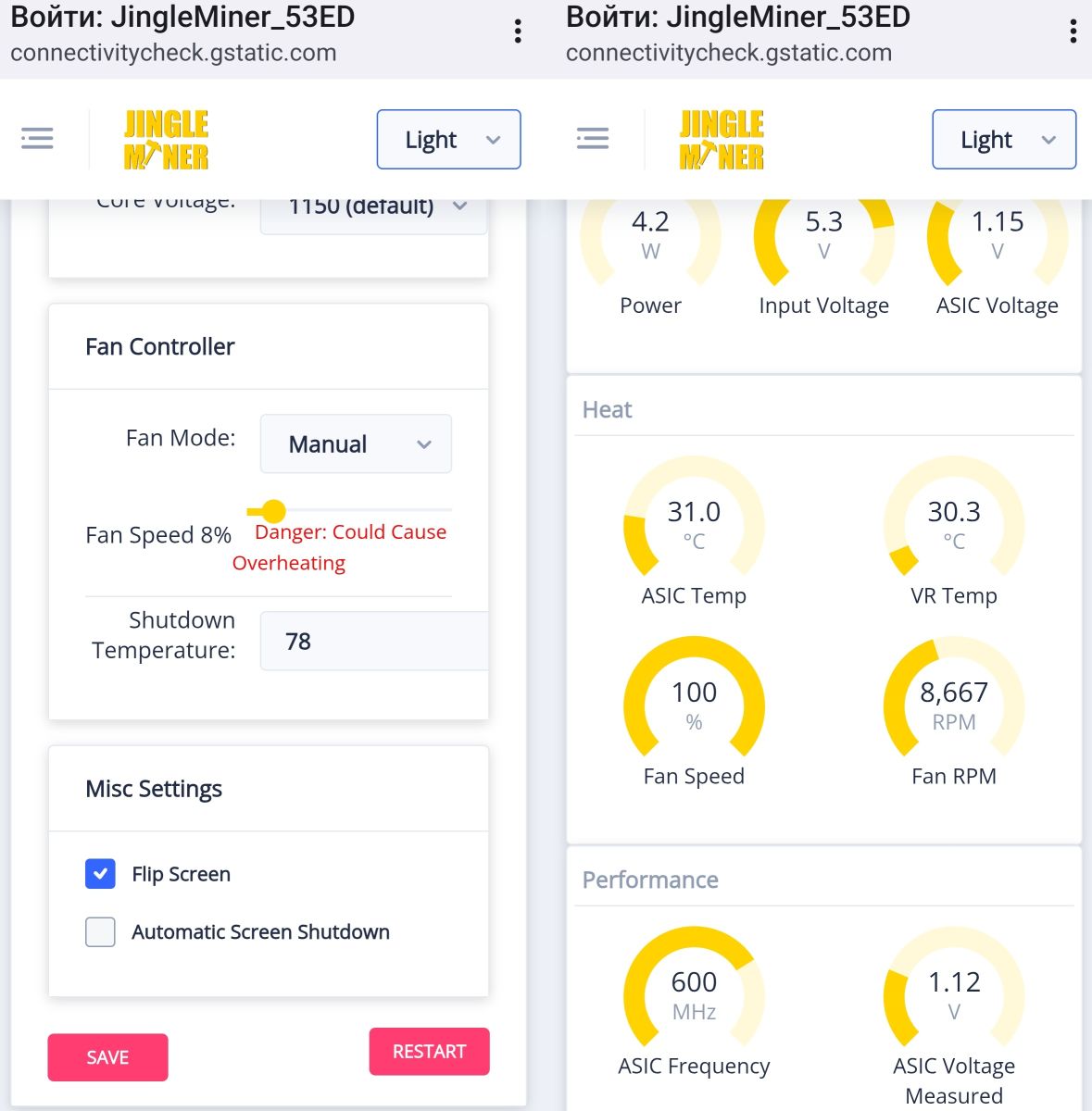 Разработчики из Jingle явно продумали сценарии применения. Например, устройство поддерживает автоматический перезапуск при потере соединения с пулом, что особенно полезно при работе через нестабильный Wi-Fi. Если интернет отключился, майнер переходит в спящий режим, снижая частоту до минимума и сохраняя энергию, а после восстановления связи самостоятельно возобновляет майнинг.