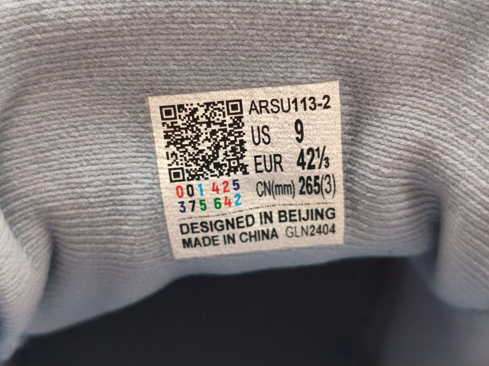 Форма колодки у ARSU113 ближе к универсальной. Она не узкая, но и не слишком широкая, подходит большинству. При этом производитель указывает, что модель соответствует размеру — и это действительно так. Кроссовки не маломерят, не жмут и не требуют долгой разнашиваемости. Стопа располагается мягко, без давления на пальцы, а скруглённый носок оставляет столько пространства, сколько нужно для естественного переката при беге. Внутренняя часть выполнена из мягкого хлопкового подкладочного материала, который хорошо повторяет форму стопы и не вызывает раздражения даже при длительной носке.