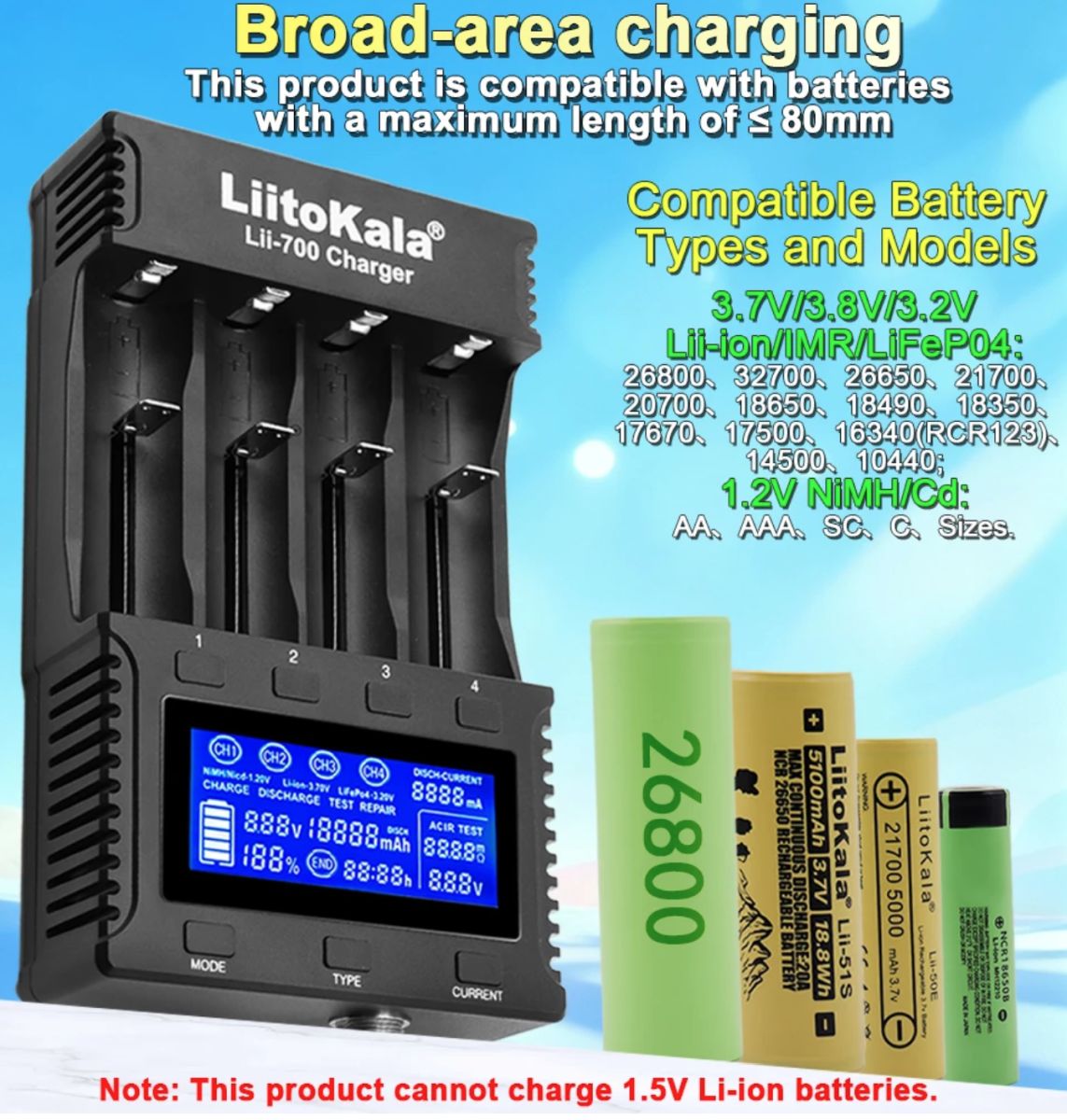 Одной из ключевых особенностей LiitoKala Lii-700 является поддержка большого количества форматов аккумуляторов. Устройство работает с популярными литий-ионными элементами, такими как 18650, а также поддерживает более крупные форматы вроде 26650 и 21700. Кроме того, зарядка совместима и с другими типами батарей, включая никель-металлгидридные и никель-кадмиевые элементы.