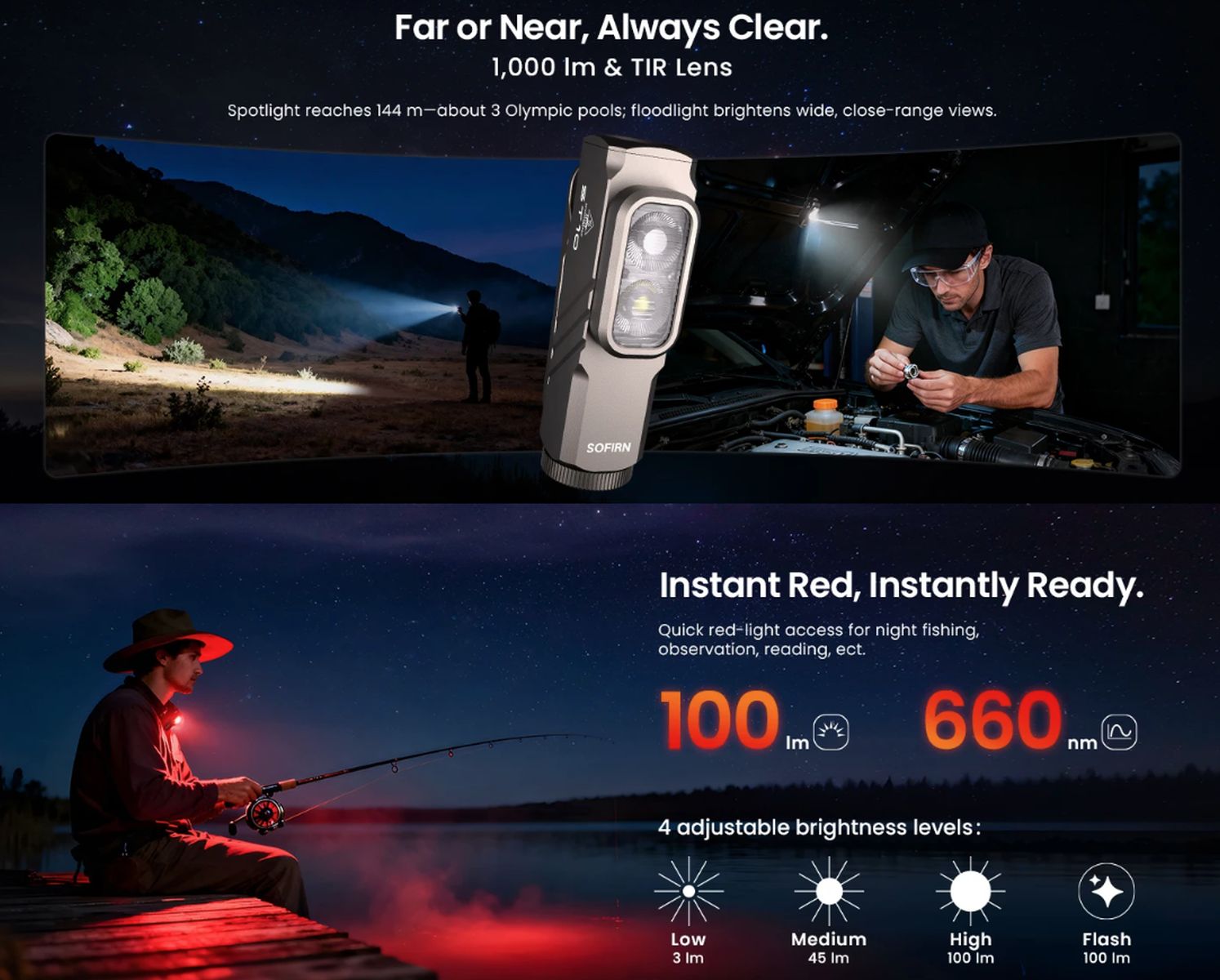 Главное, что отличает SOFIRN ST10 от множества компактных фонарей, — это продуманная система освещения. Здесь нет попытки удивить только цифрами, вместо этого сделан упор на практику. Основной белый свет выдаёт до 1000 люмен, что для фонаря такого размера выглядит более чем внушительно. Этот поток позволяет уверенно освещать пространство на дистанции, достаточной для прогулок в тёмное время суток, поиска ориентиров, проверки территории или использования в аварийных ситуациях.