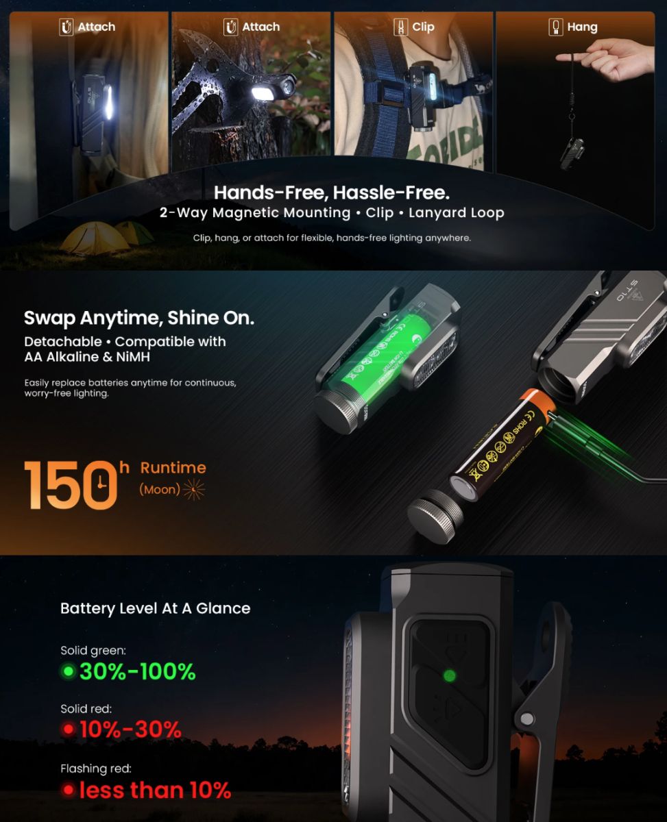 Магнитный хвост и прочная клипса сразу задают направление использования. Фонарь можно закрепить на металлической поверхности, повесить на карман, ремень или лямку рюкзака, а также установить на козырёк кепки. Это подчёркивает его EDC-направленность и делает ST10 особенно удобным для ситуаций, где важны свободные руки.