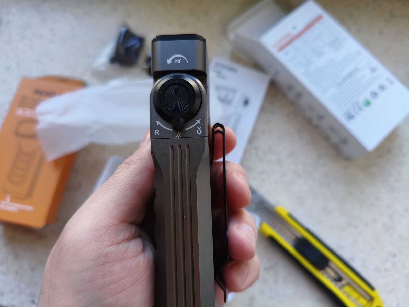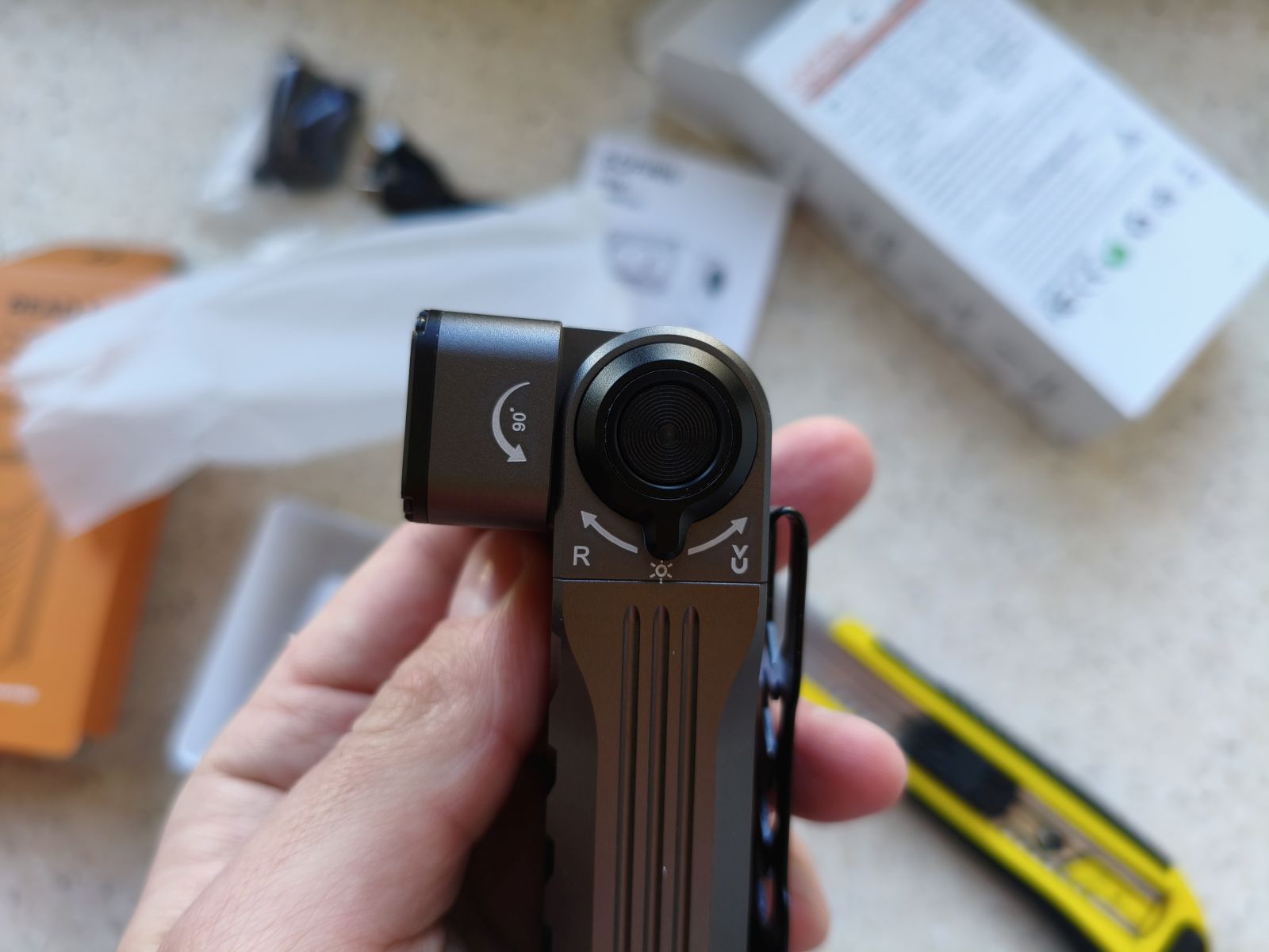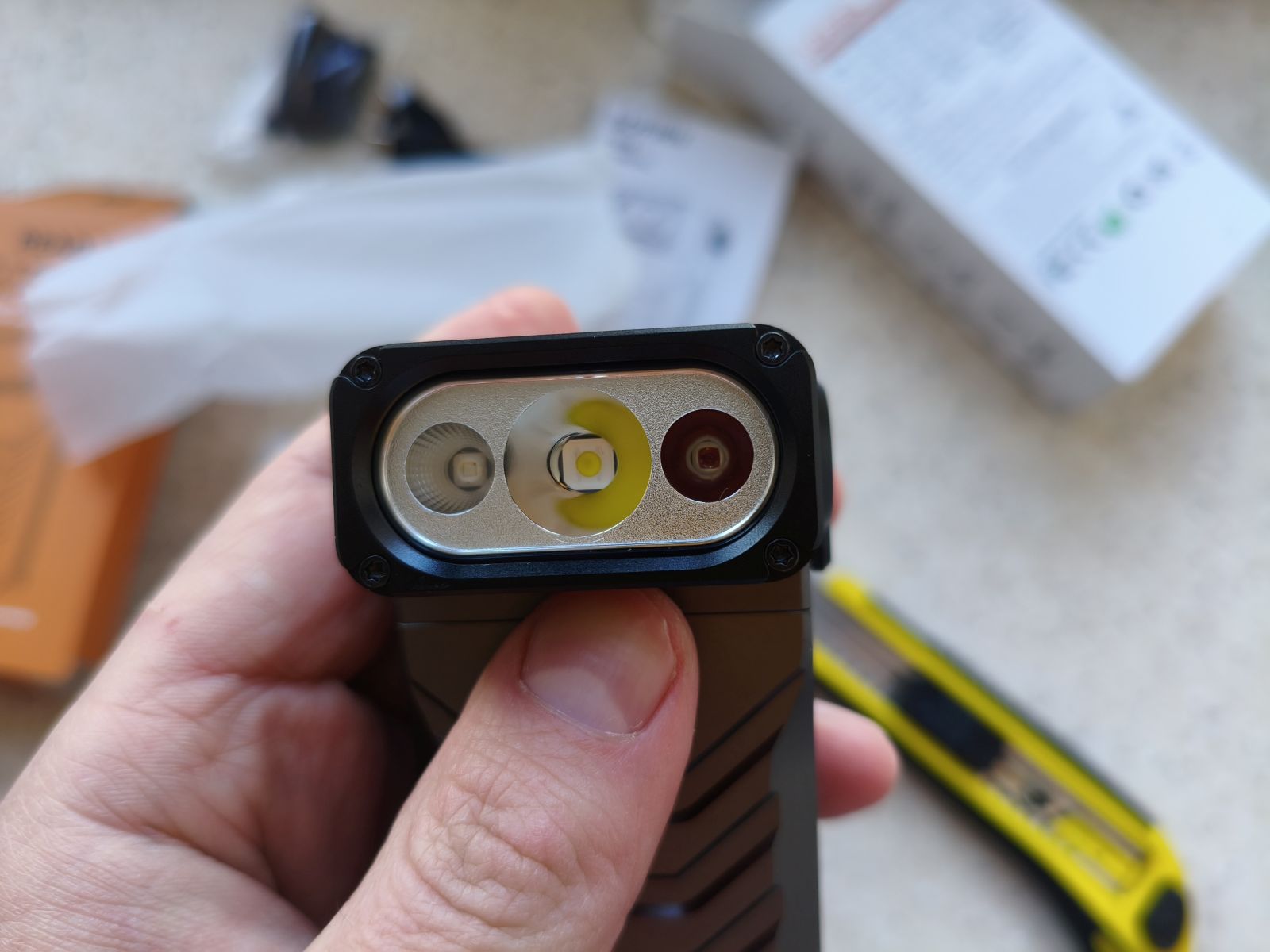 Вес фонаря составляет около 248 граммов вместе с аккумулятором. Это не самый лёгкий EDC-фонарь, но для модели с несколькими источниками света и мощной оптикой такой показатель вполне нормальный. В руке устройство ощущается надёжным и прочным.