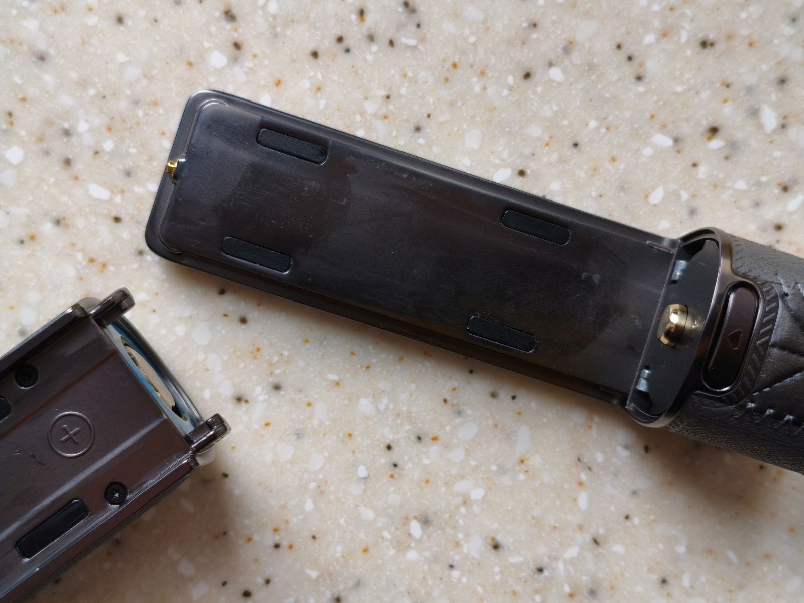 Очень интересная система батарейного отсека. По нажатию кнопки отщелкивается как половина корпуса и туда ставиться аккумулятор. После устанавливается на магниты и по направляющим — до щелчка.